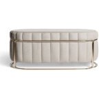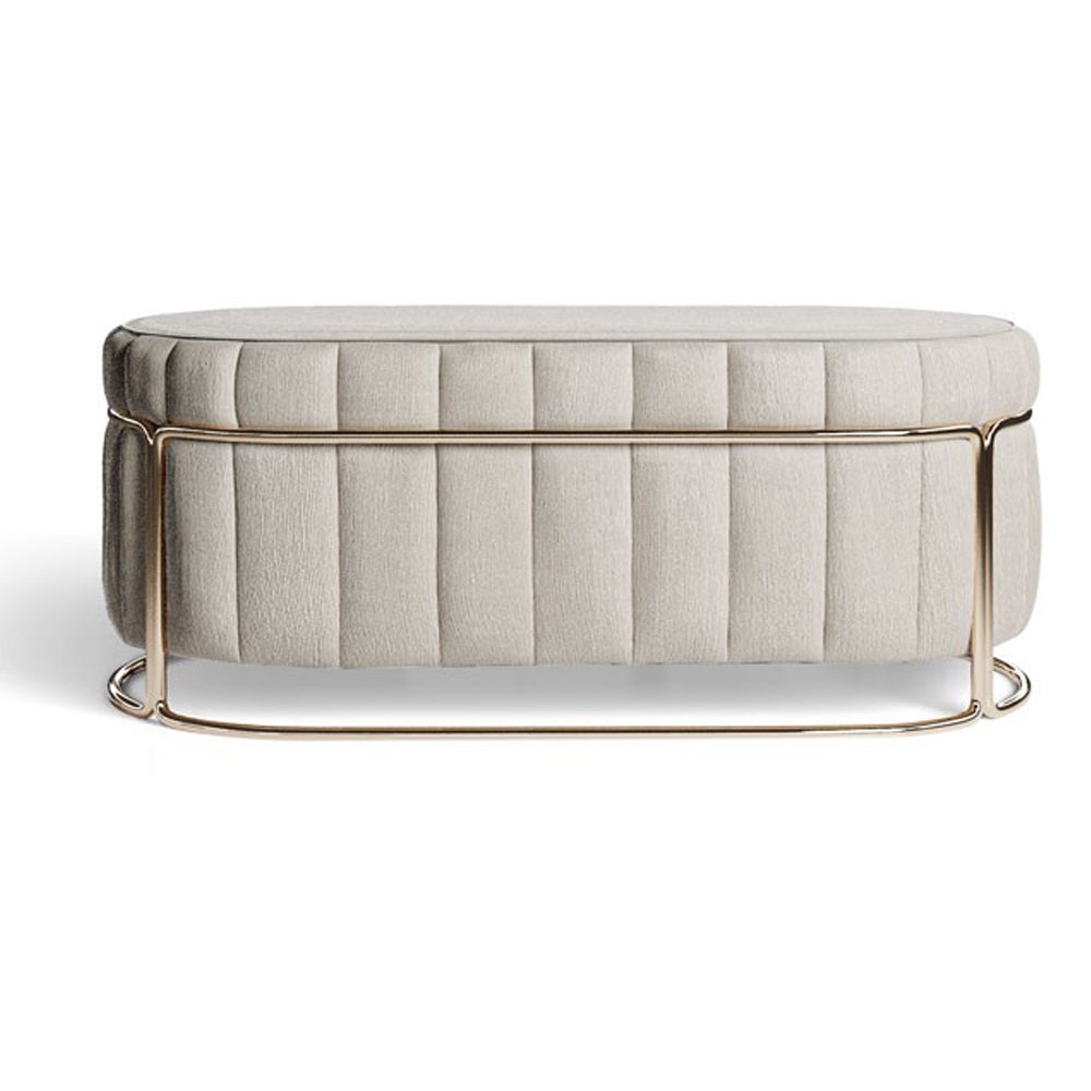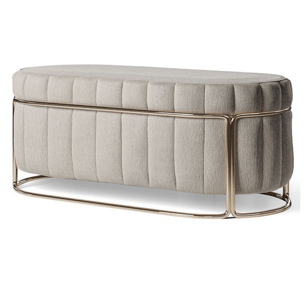 Sophisticated oval bench with a plush channel-tufted seat and sleek metal frame base. Its soft upholstery and refined silhouette add modern elegance and versatile seating to bedrooms, living areas, or entryways.