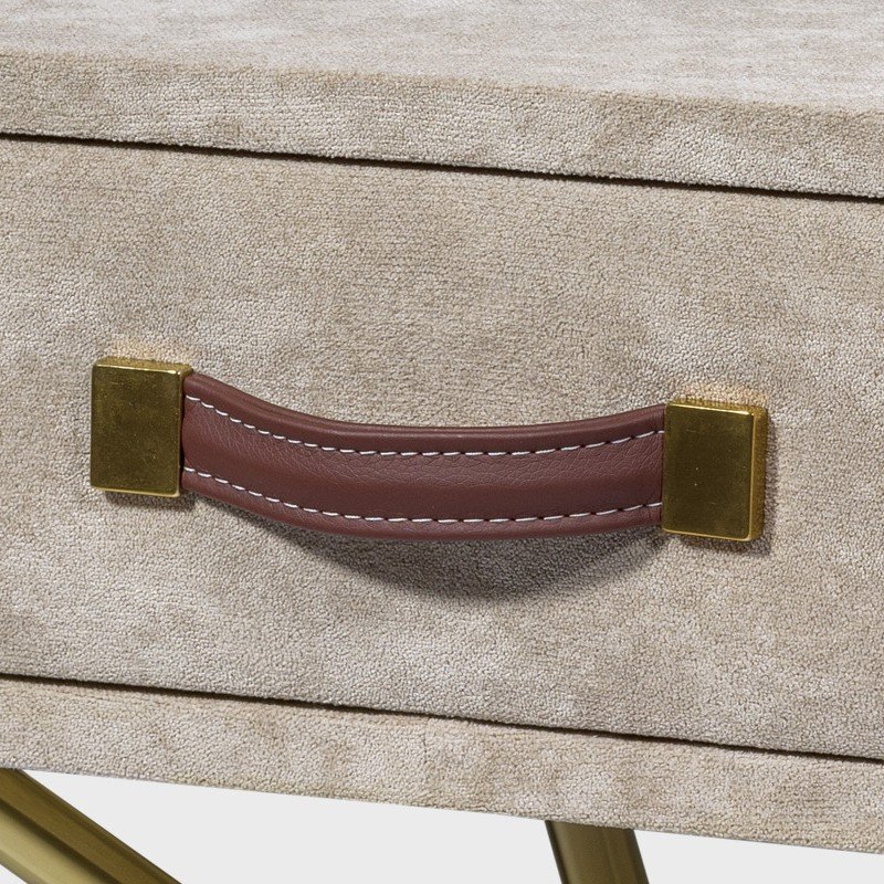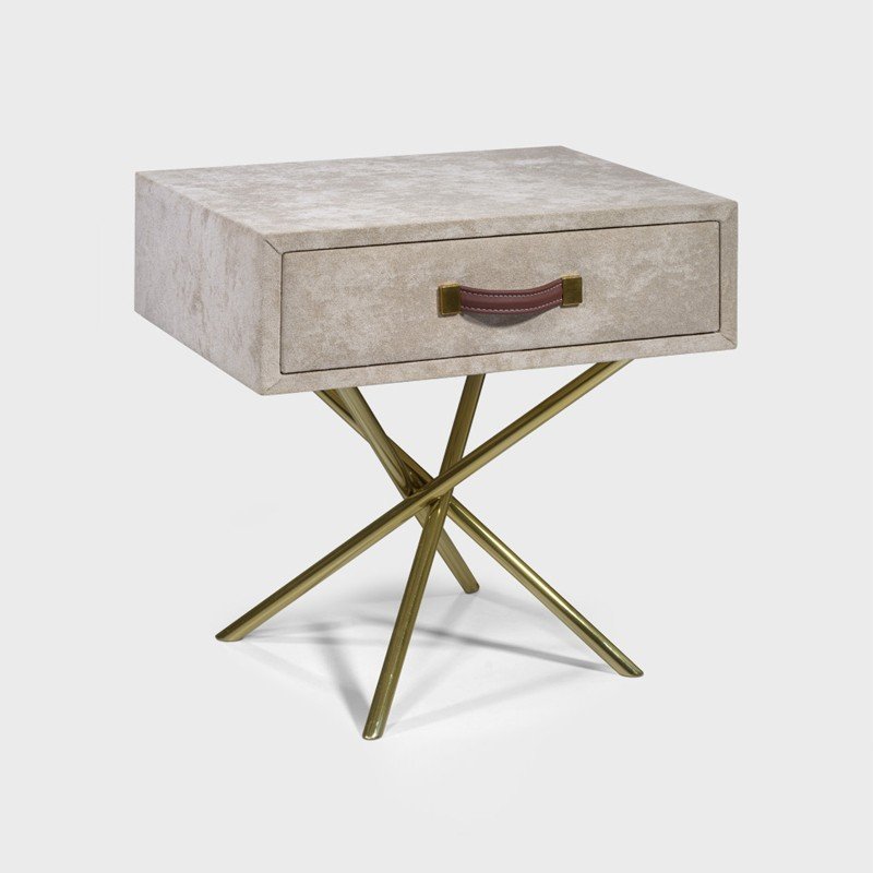 The Berkeley End Table combines elegance and practicality with its luxurious design. Featuring a soft upholstery finish and a single drawer with a leather handle, this table exudes modern sophistication. The crisscross brass base adds a touch of glamour, while providing stability. Ideal for those seeking a stylish, functional piece to elevate their living space.