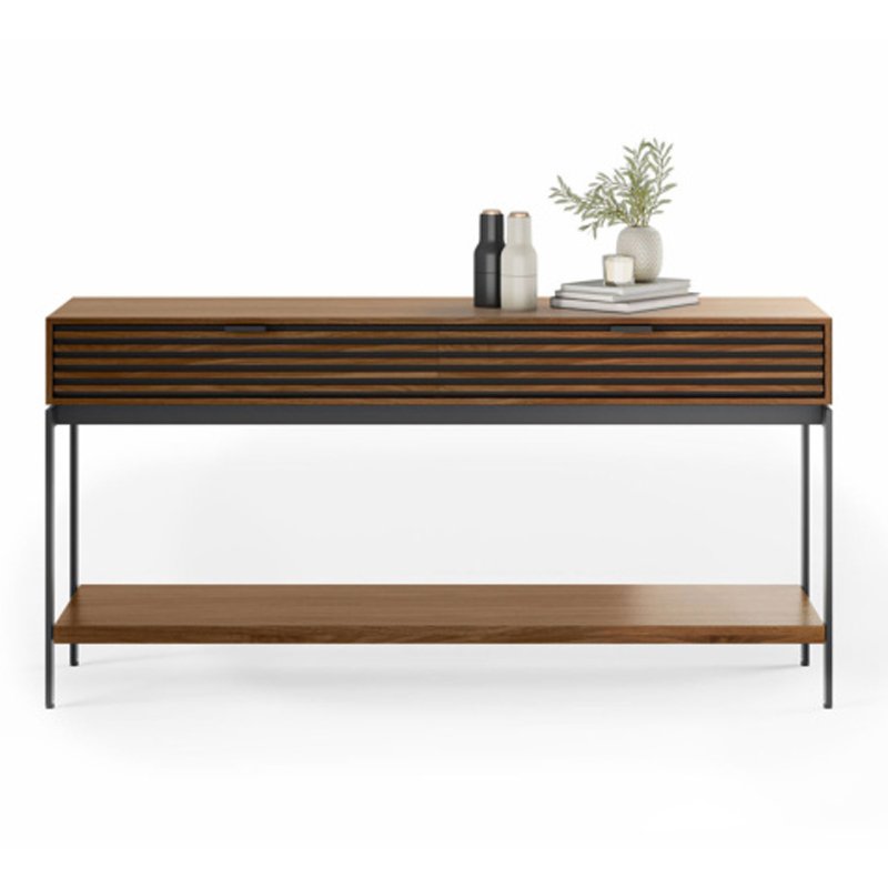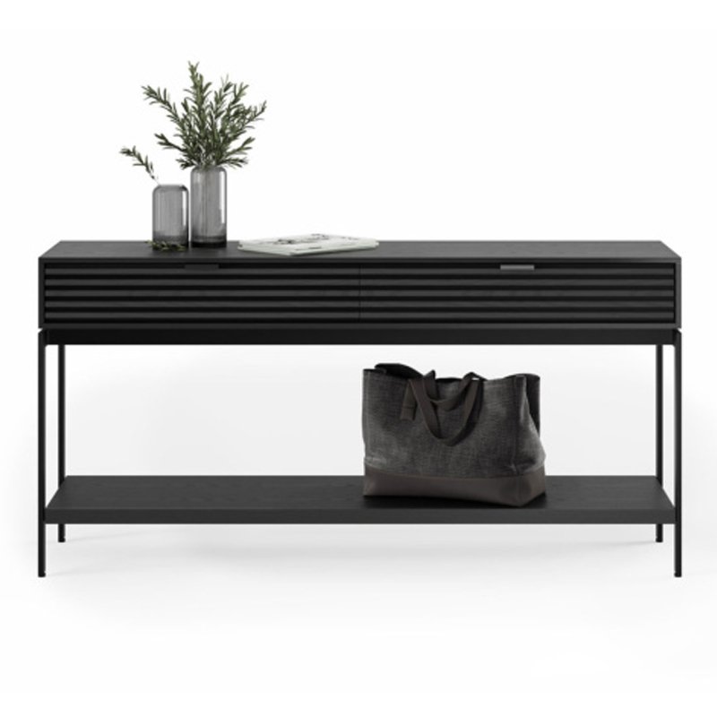 This sleek and contemporary console table features a beautiful striped wood design on the drawers, complemented by a sturdy metal frame. The lower shelf offers extra storage, while the minimalist design effortlessly enhances any modern living space.