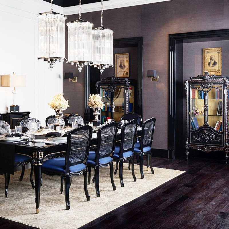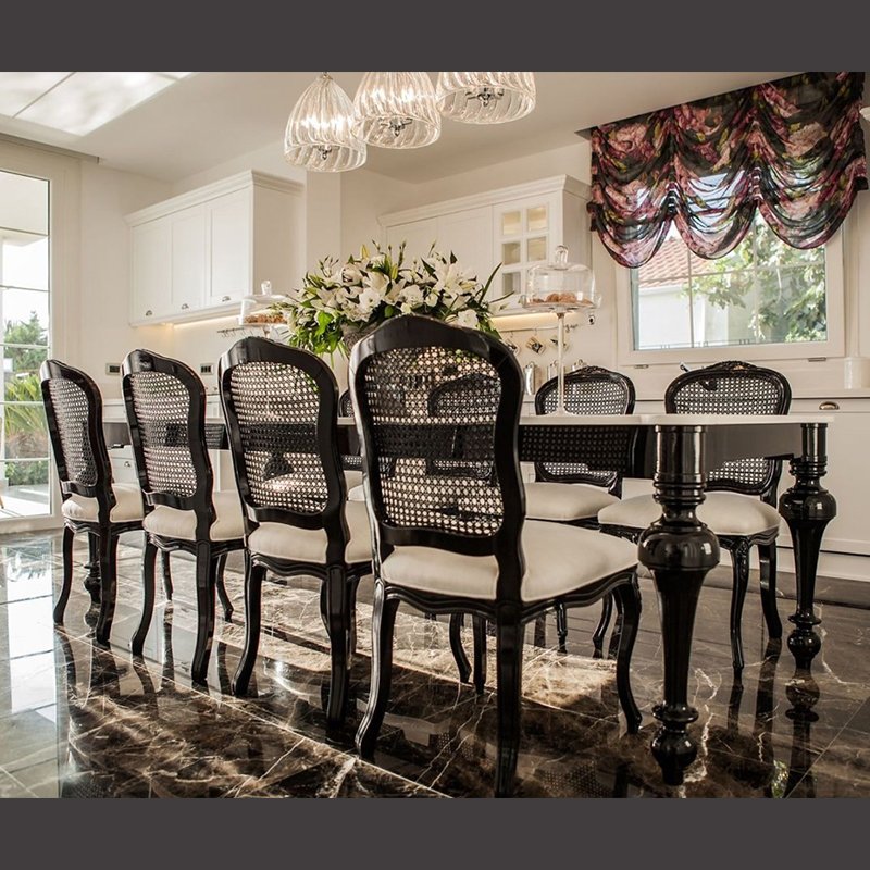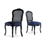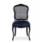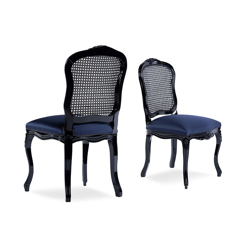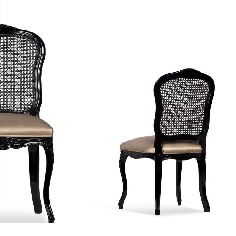 This elegant dining chair features a classic design with a black caned backrest and a luxurious upholstered seat. The finely crafted wood frame, with intricate carvings and graceful curved legs, adds a touch of timeless sophistication to any dining room or formal setting.