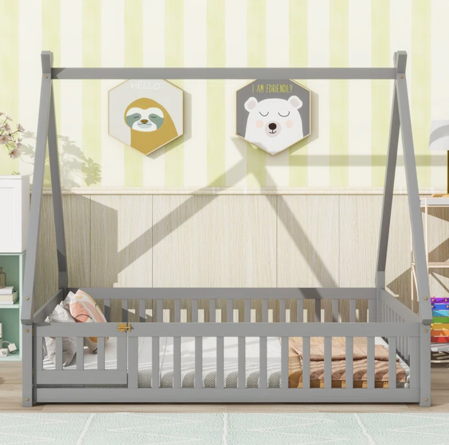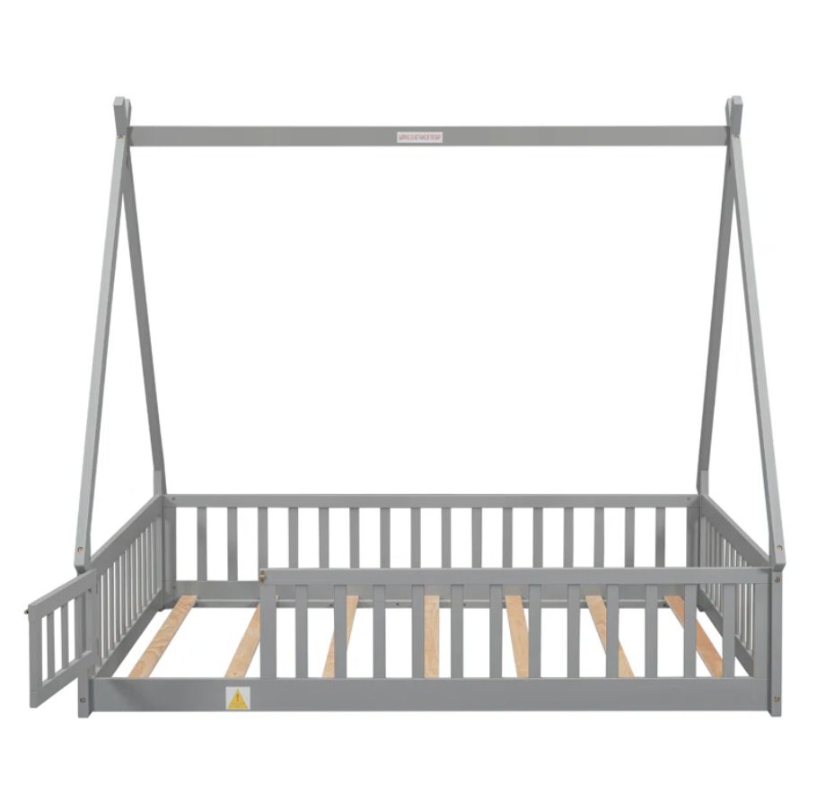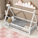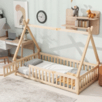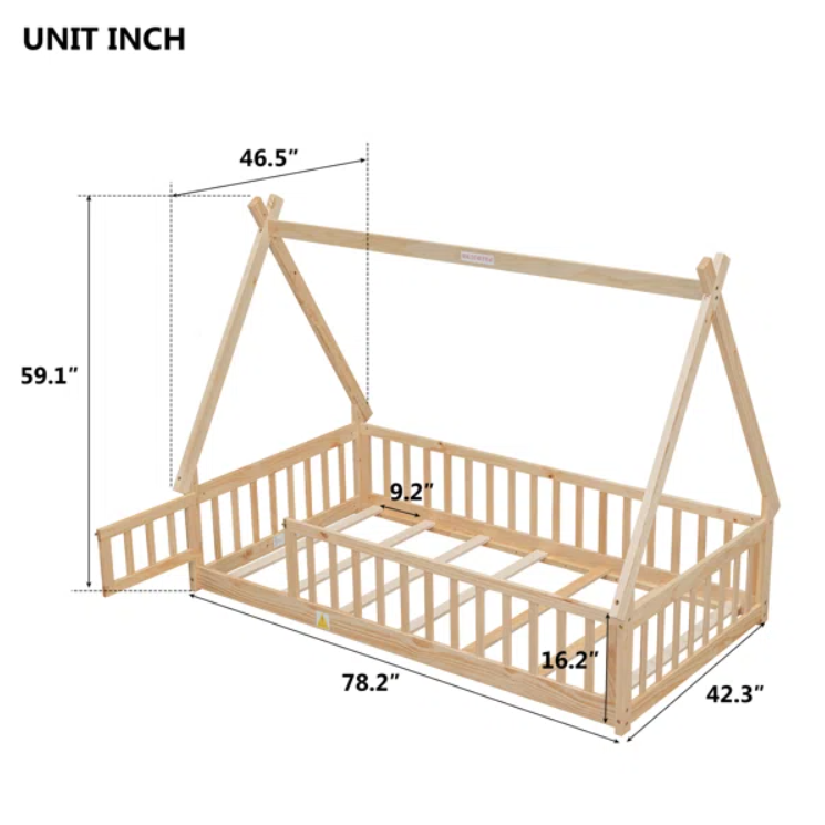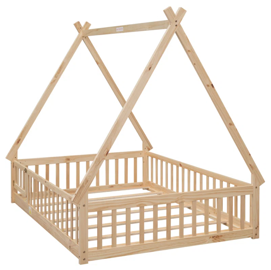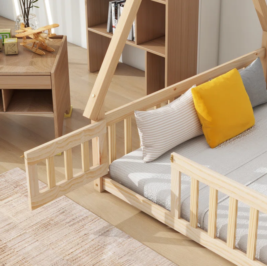 Bring fun and comfort to your child’s room with this charming house-shaped wooden bed. Made from natural pine wood, it features a cozy low-to-the-ground design with safety rails and an open canopy frame—perfect for imaginative play and restful sleep.