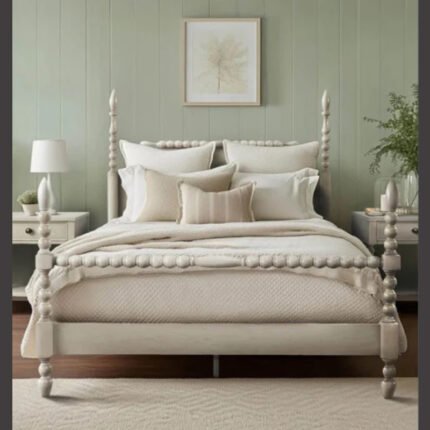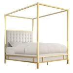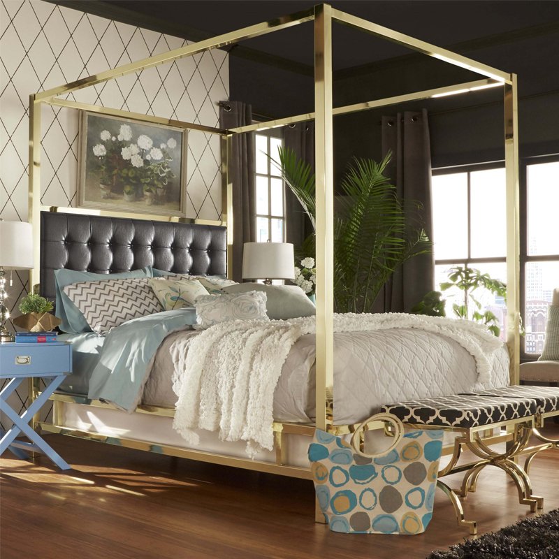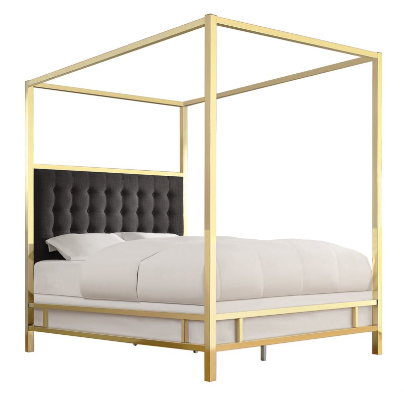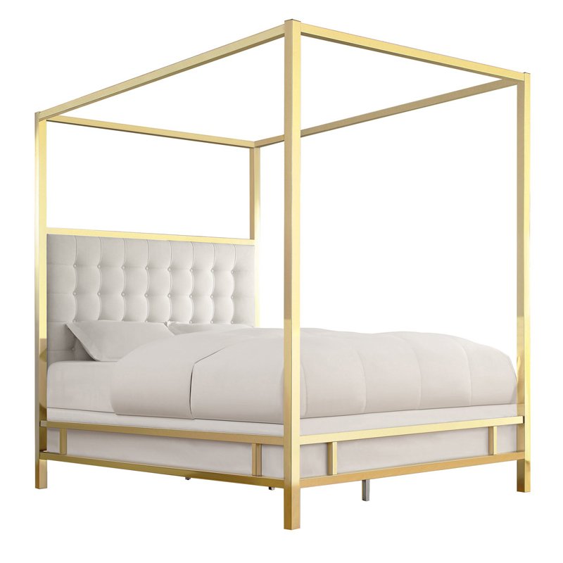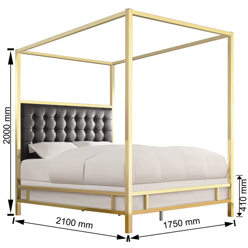 The Canopy Bed: Command attention with this glamorous centrepiece. Featuring a bold, polished gold frame and a plush, diamond-tufted velvet headboard, this bed infuses any bedroom with regal elegance and high-fashion luxury. It’s the ultimate statement of style.