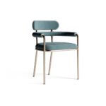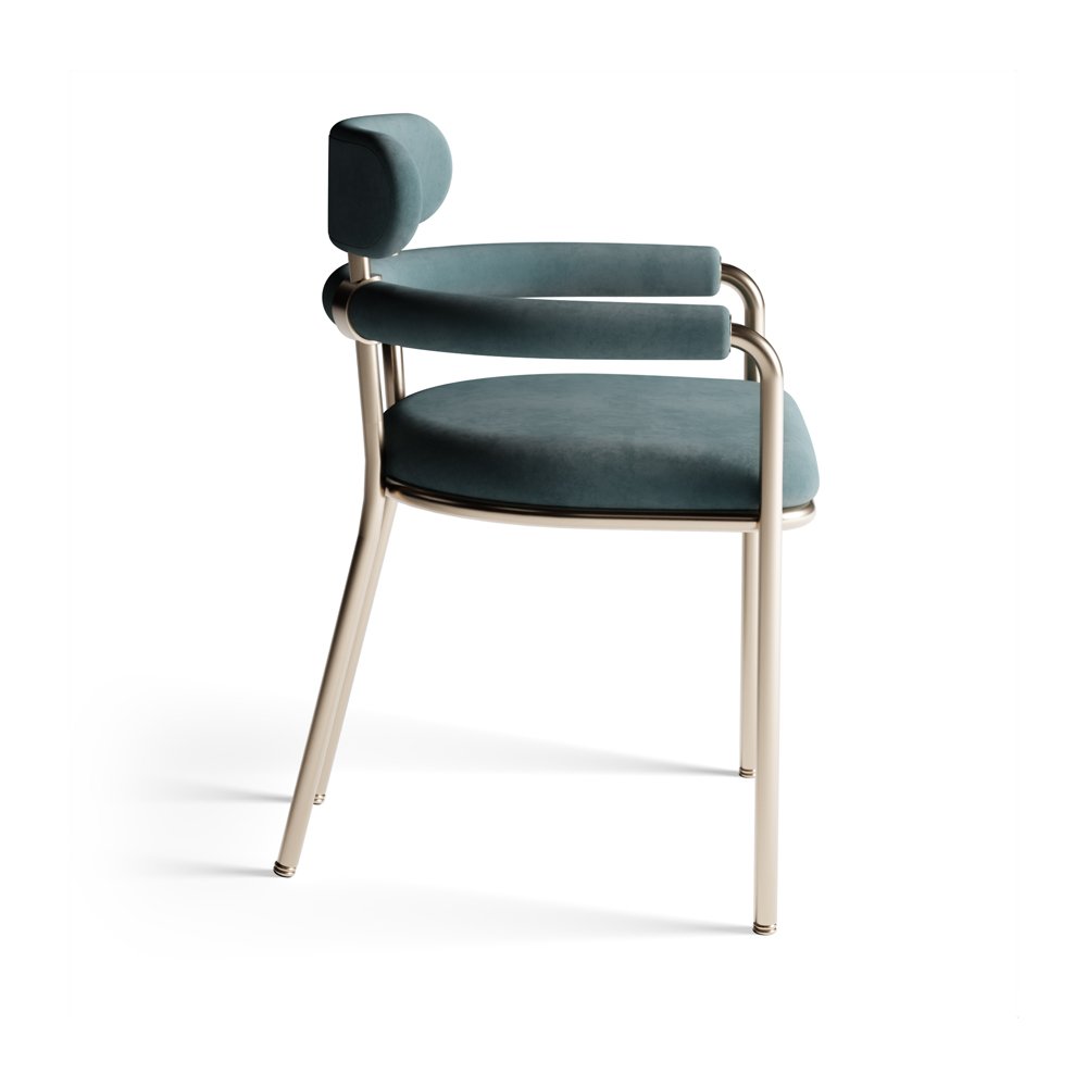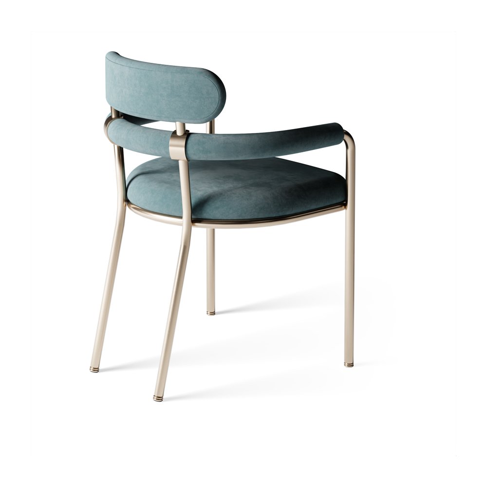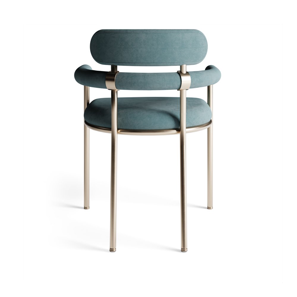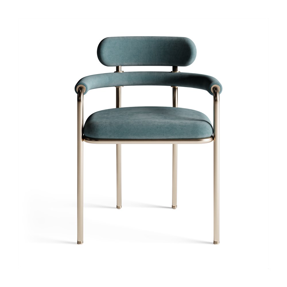 This contemporary dining chair features a sleek design with soft velvet upholstery and a minimalistic metal frame. The stylish curved backrest and arms add a touch of elegance, making it a perfect blend of modern sophistication and comfort for any dining space.