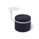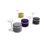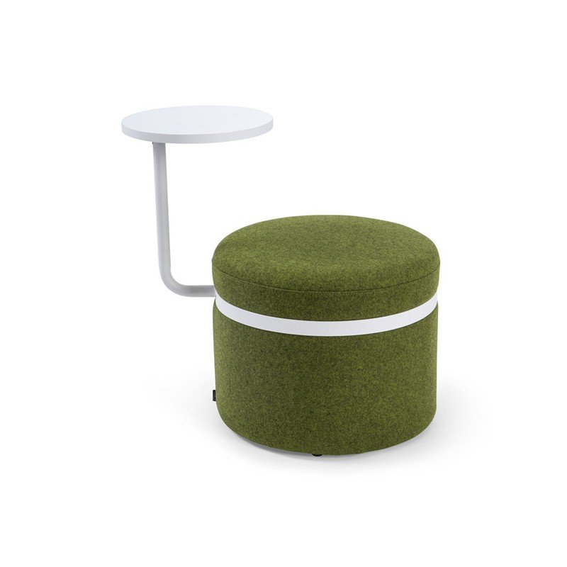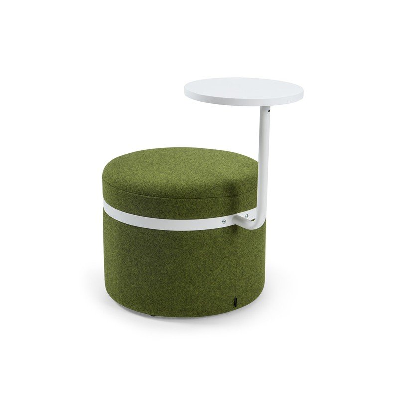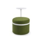 A modern, cylindrical upholstered stool featuring an integrated laptop tray and a sleek metal accent band.
