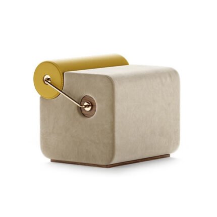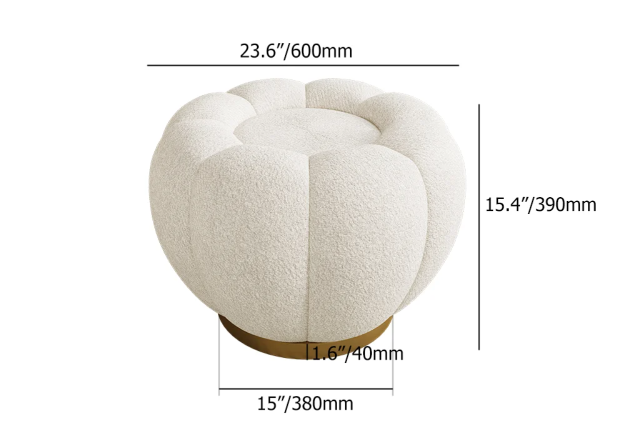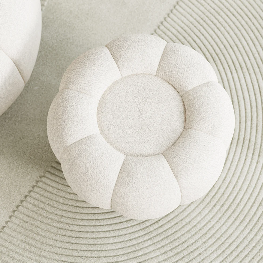 Plush sculptural stool with a rounded, petal-inspired form and soft textured upholstery. Set on a sleek base, it offers cozy seating while adding a playful yet sophisticated accent to modern interiors.