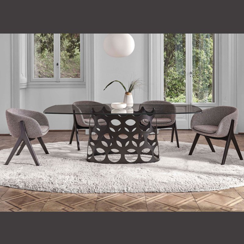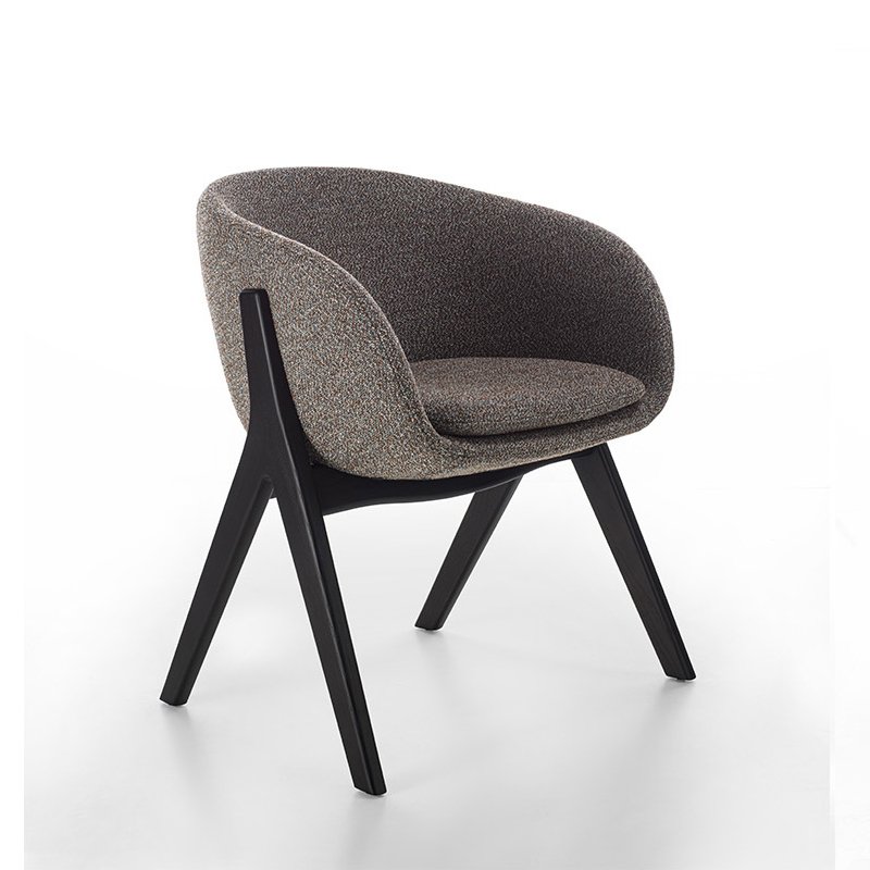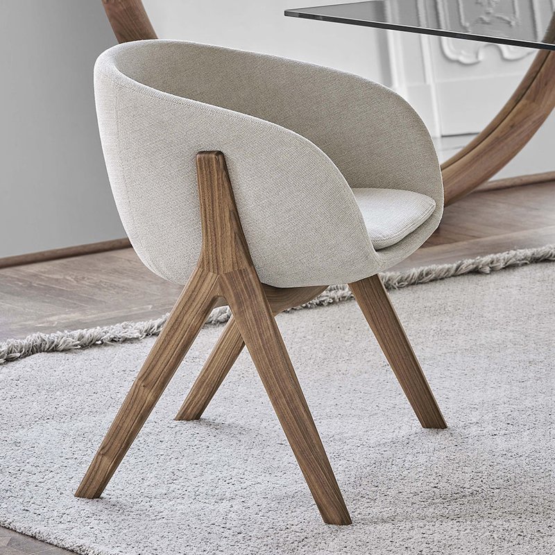 The Ginza Dining Chair combines modern design with comfort, featuring a sleek, upholstered seat in a textured fabric. Its angular wooden legs offer sturdy support, while the rounded backrest provides a cosy yet stylish seating experience, perfect for contemporary dining spaces.