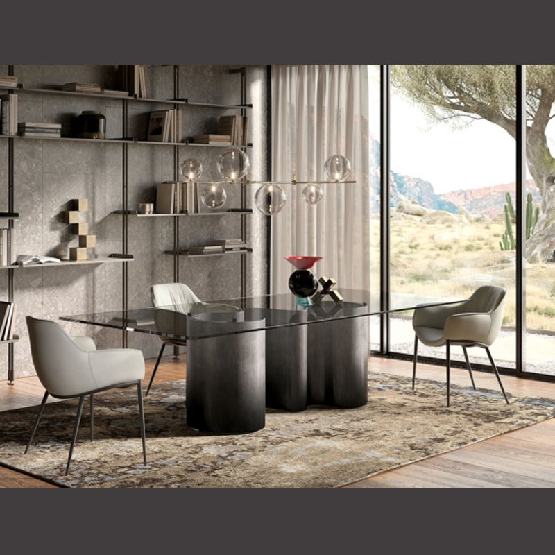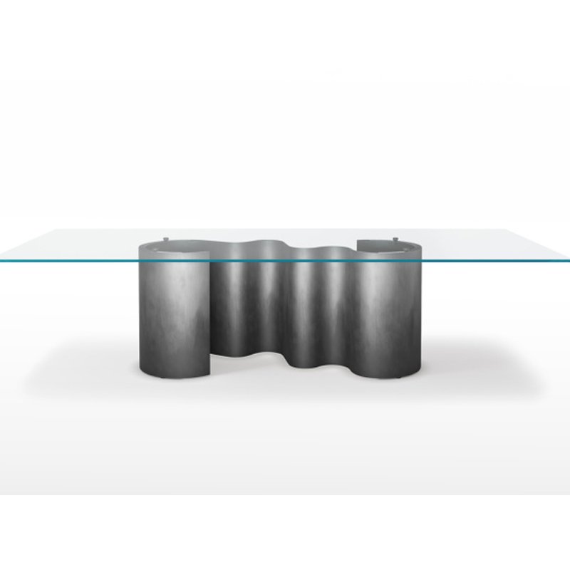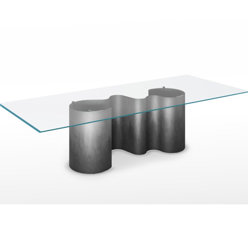 A contemporary dining table featuring a rectangular glass top supported by a sculptural, wave-shaped metallic base with a gradient finish.
