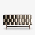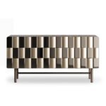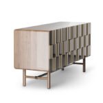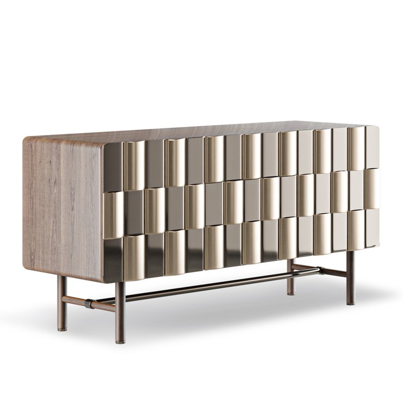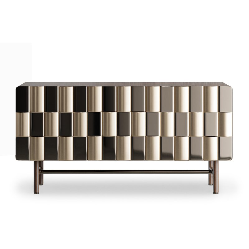 Striking and contemporary console with a geometric, metallic facade that adds texture and depth. A bold statement piece that blends modern artistry with functional design.