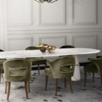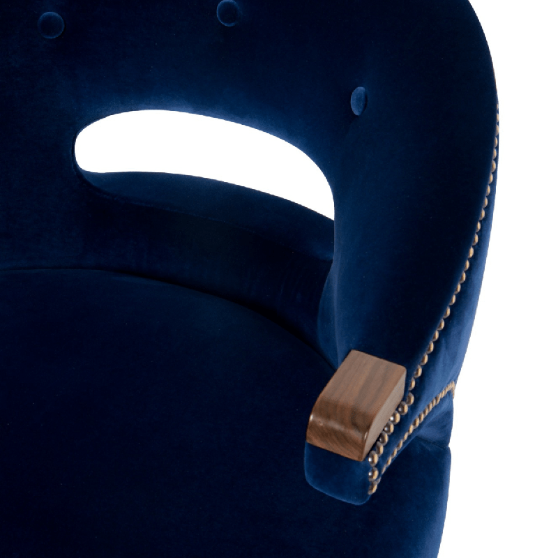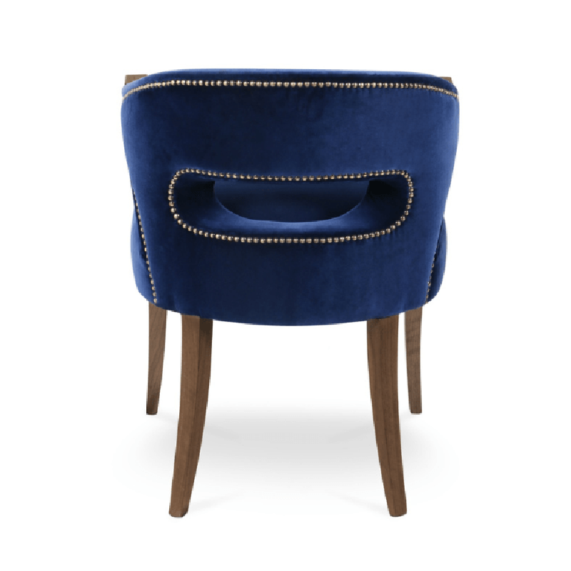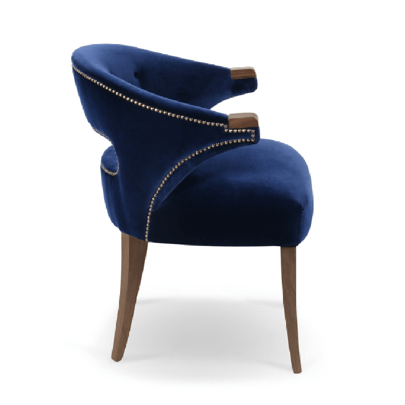 This luxurious dining chair features soft upholstery, complemented by elegant wood legs and a chic curved backrest with stylish nail head detailing. Its sophisticated design adds a touch of glamour and comfort to any modern or classic dining space.