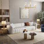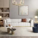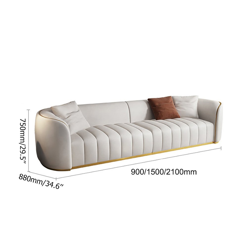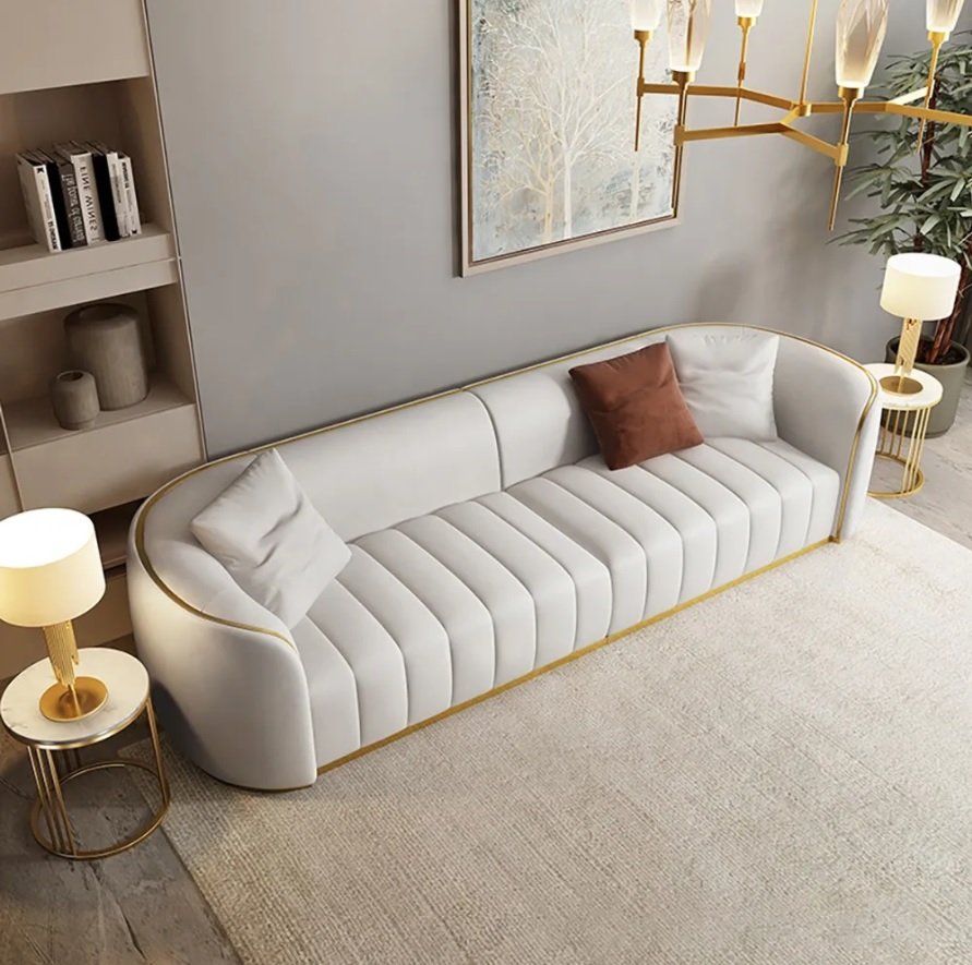 The Peninsula Sofa is the epitome of contemporary elegance, featuring clean lines, deep vertical tufting, and refined gold accents that frame its base and edges. Upholstered in premium, soft-touch fabric, it offers exceptional comfort and durability. The generously padded seats and low-profile design create a relaxed yet luxurious aesthetic, while the contrasting throw pillows add a touch of warmth and style.
