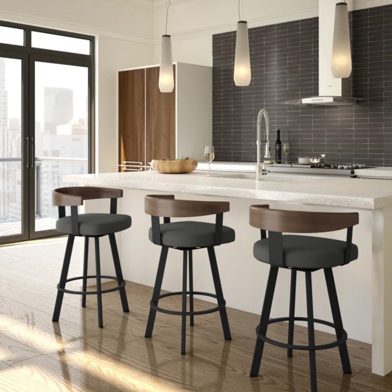 This retro bar stool set gives a complete renovation to your dining room or kitchen island. Each stool boasts a modernly curved back for ergonomic support and a plush, round seat upholstered in soft beige velvet for ultimate comfort. A set of these bar stools surely brings sophistication and practicality to the modern home.