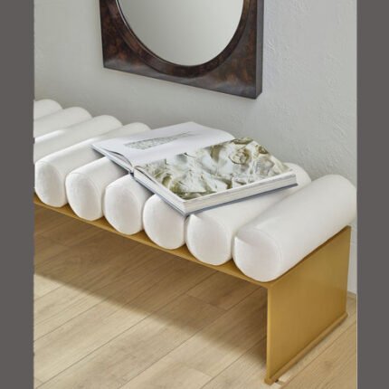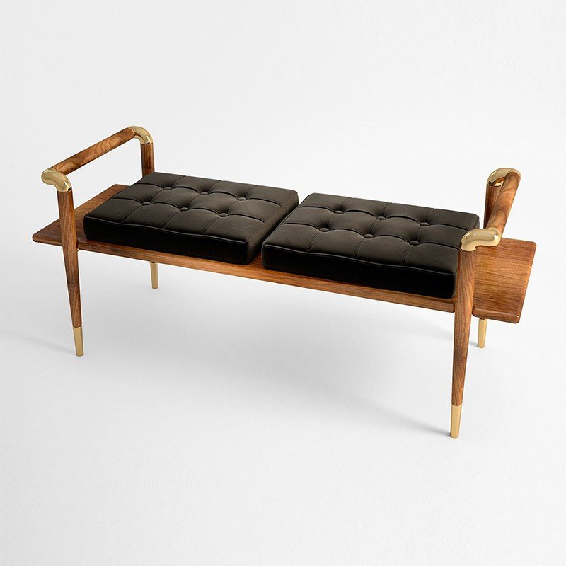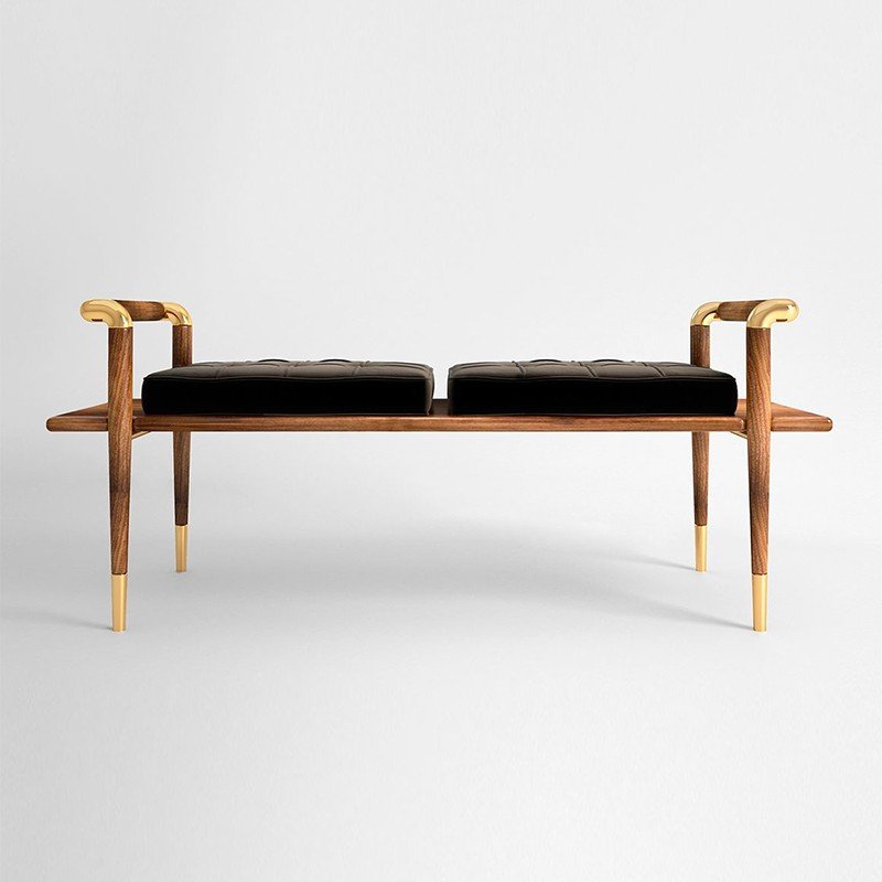 Elegant statement bench crafted with a rich wood frame, sculptural arm details, and luxe brass accents. Finished with tufted cushions for added comfort, it brings a refined, modern-classic touch to entryways, bedrooms, or living spaces.