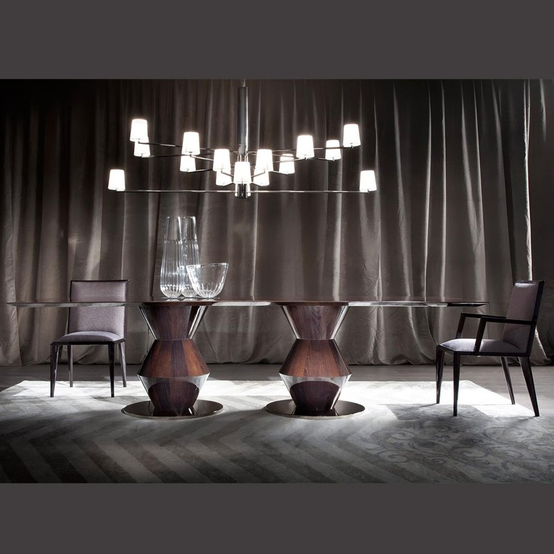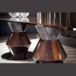A sophisticated modern dining room featuring a high-gloss, geometric wood pedestal table set against heavy charcoal drapes and a patterned blue rug.