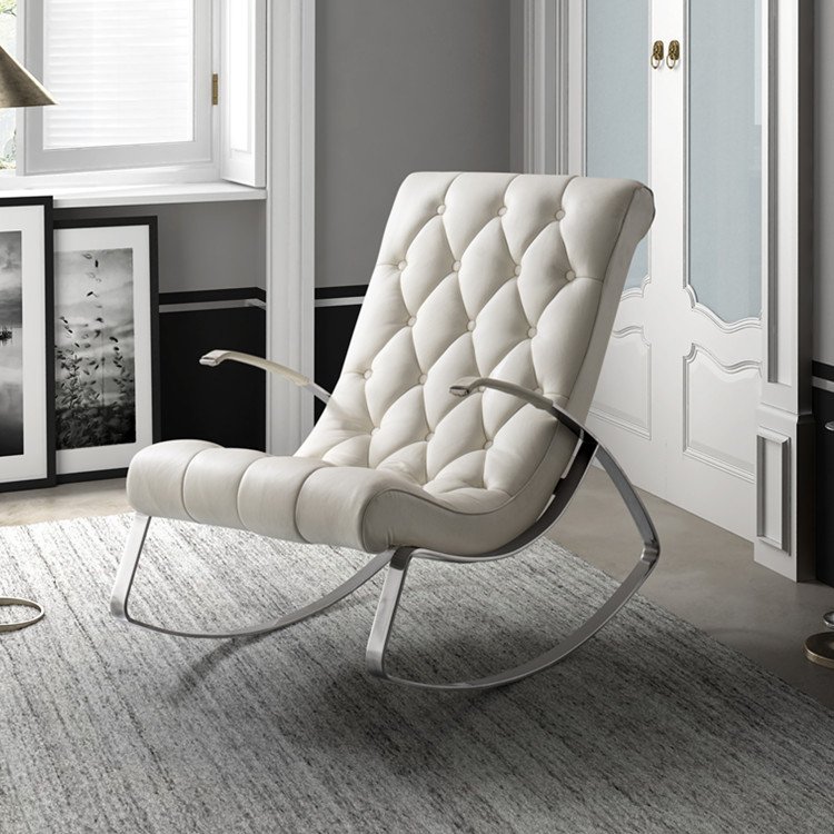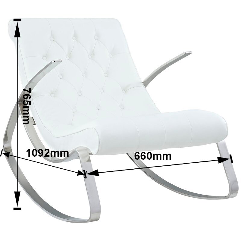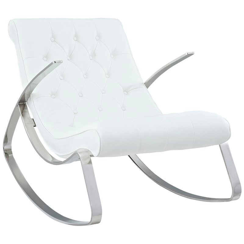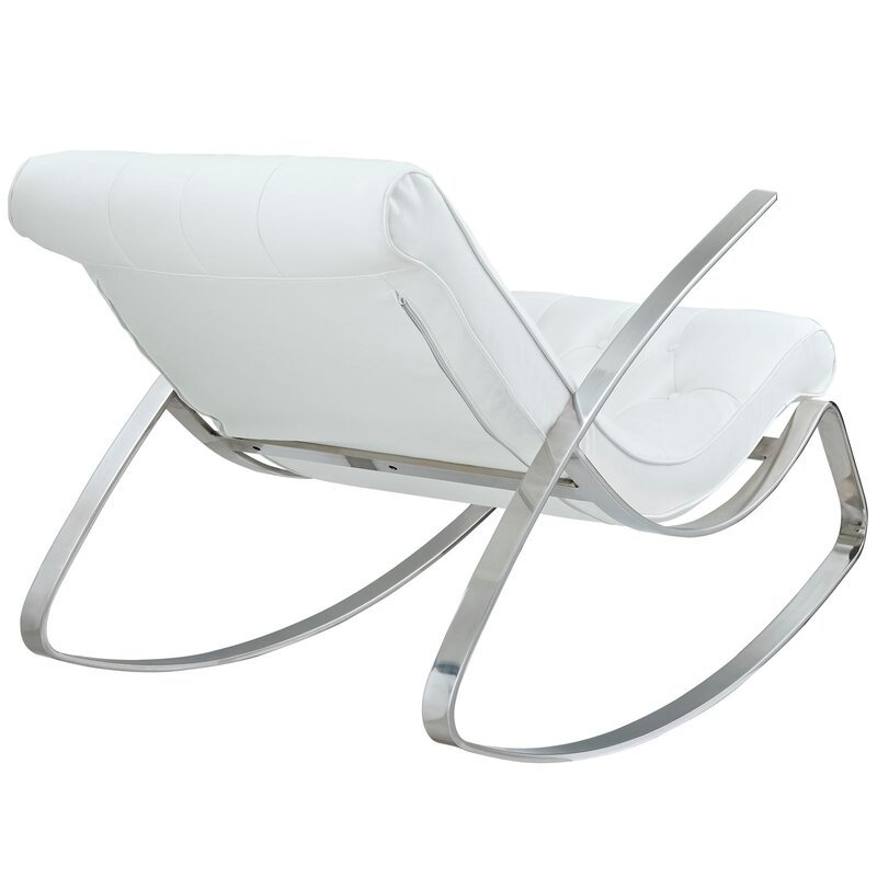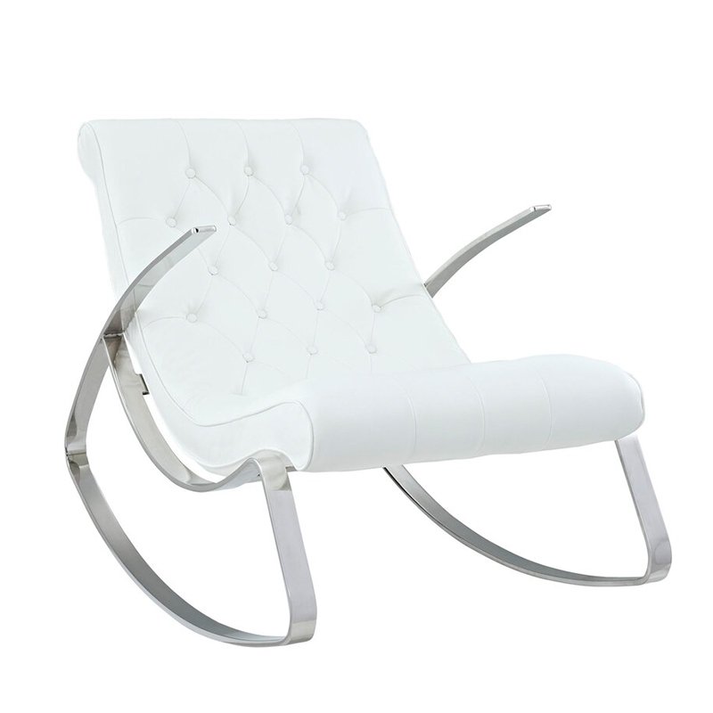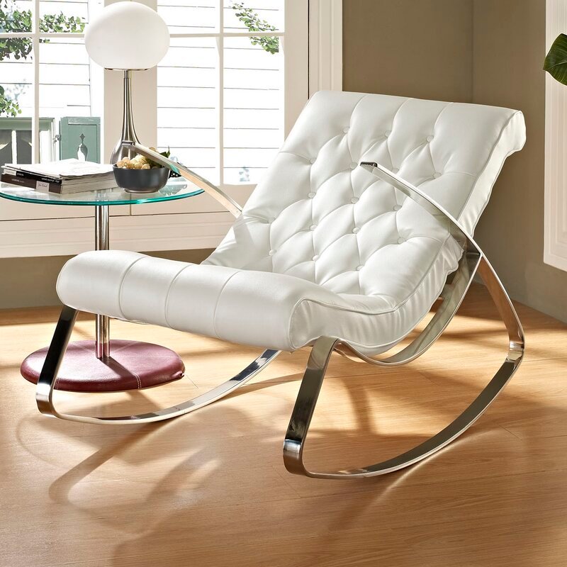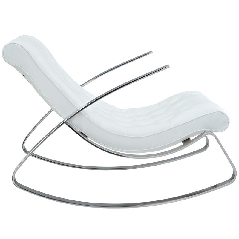 Relax in style with this modern rocking chair featuring a sleek chrome frame and tufted faux leather upholstery. Its contemporary design offers both comfort and elegance, making it a perfect addition to any living room or reading nook.