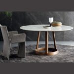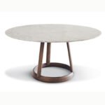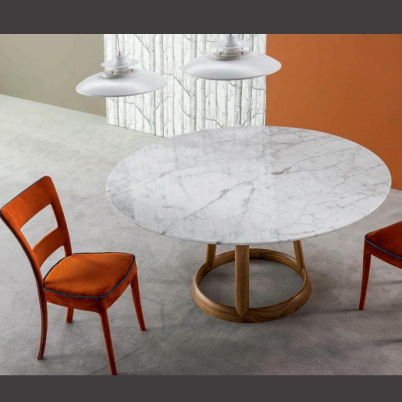 Modern round dining table featuring a white marble top supported by a sculptural dark wood tripod base and circular floor ring.