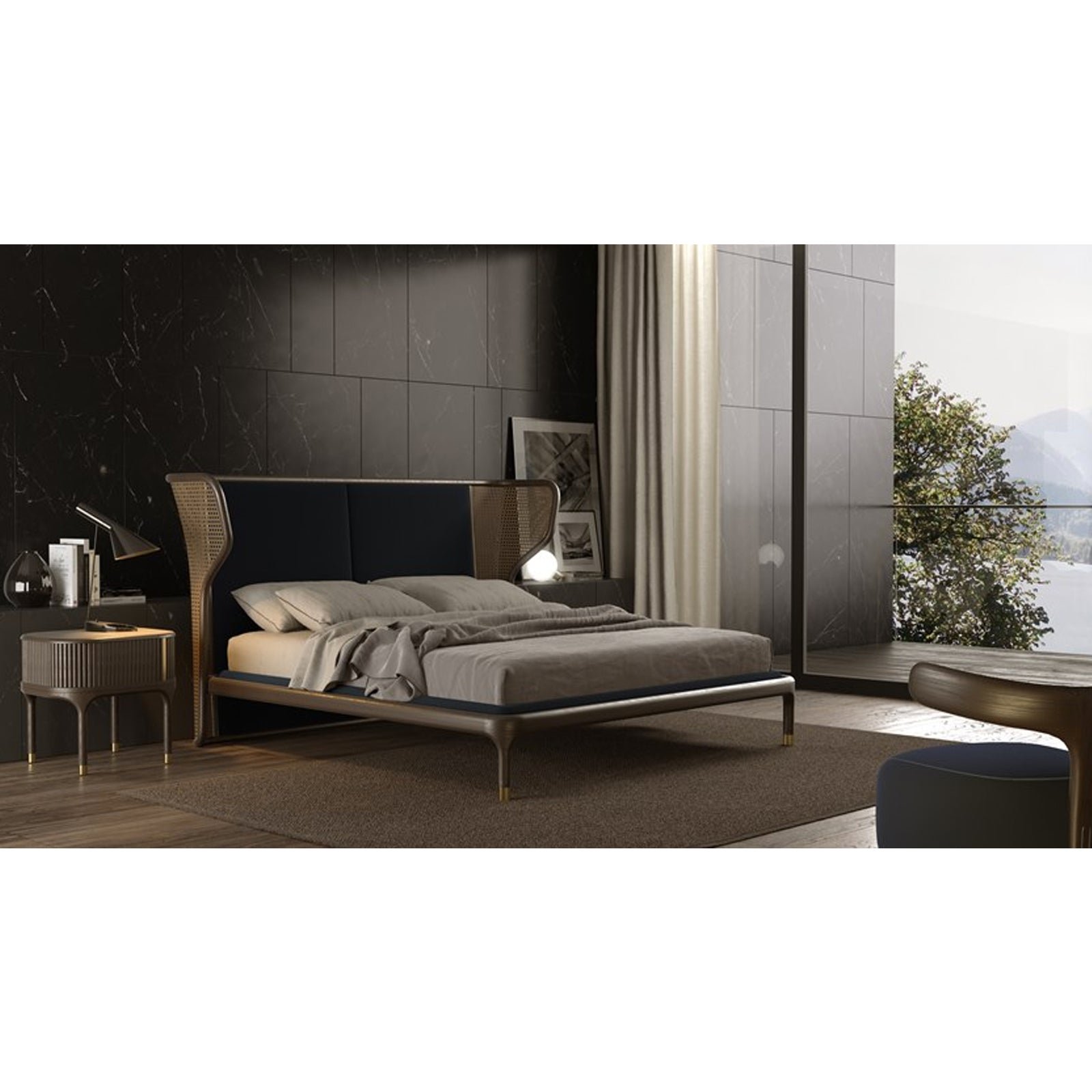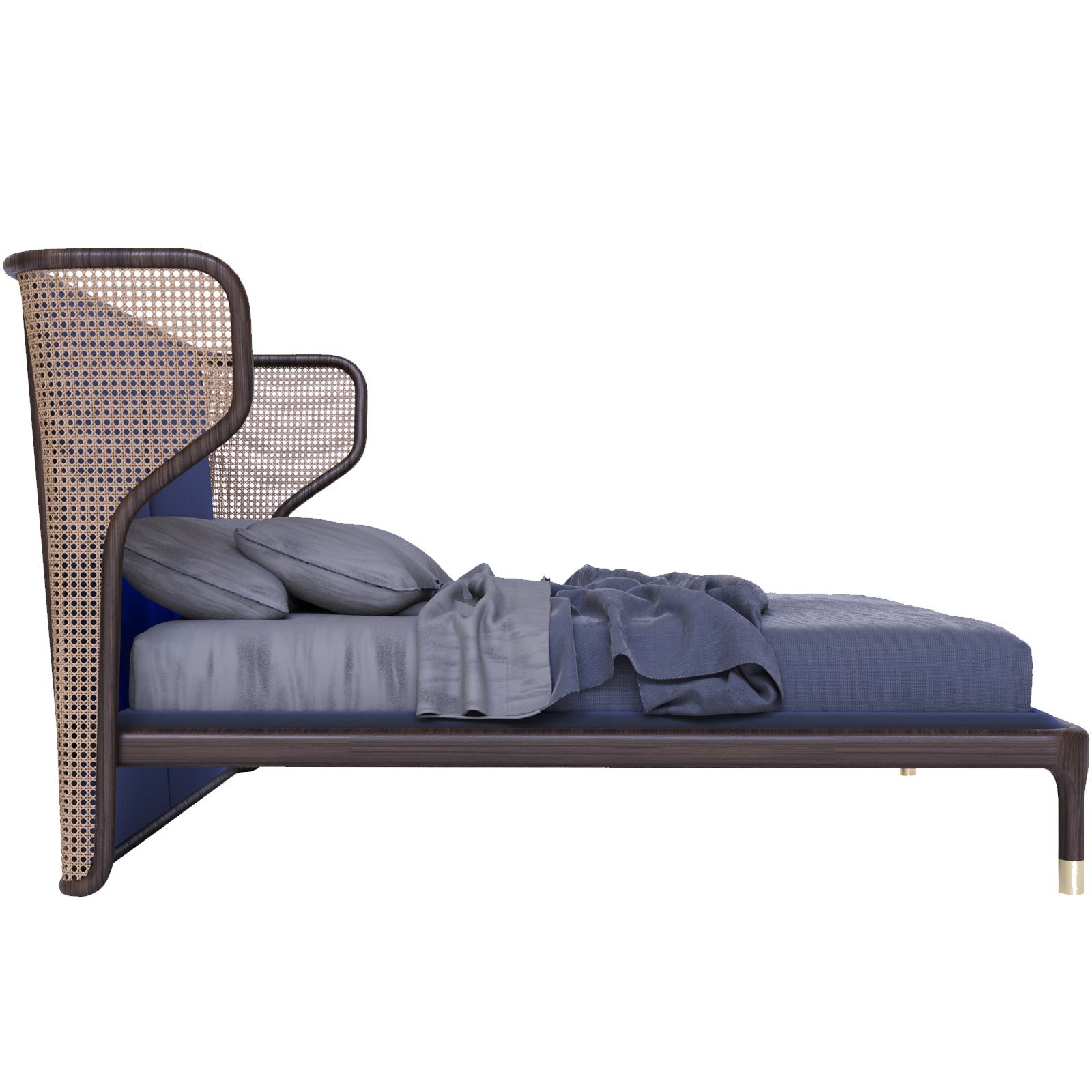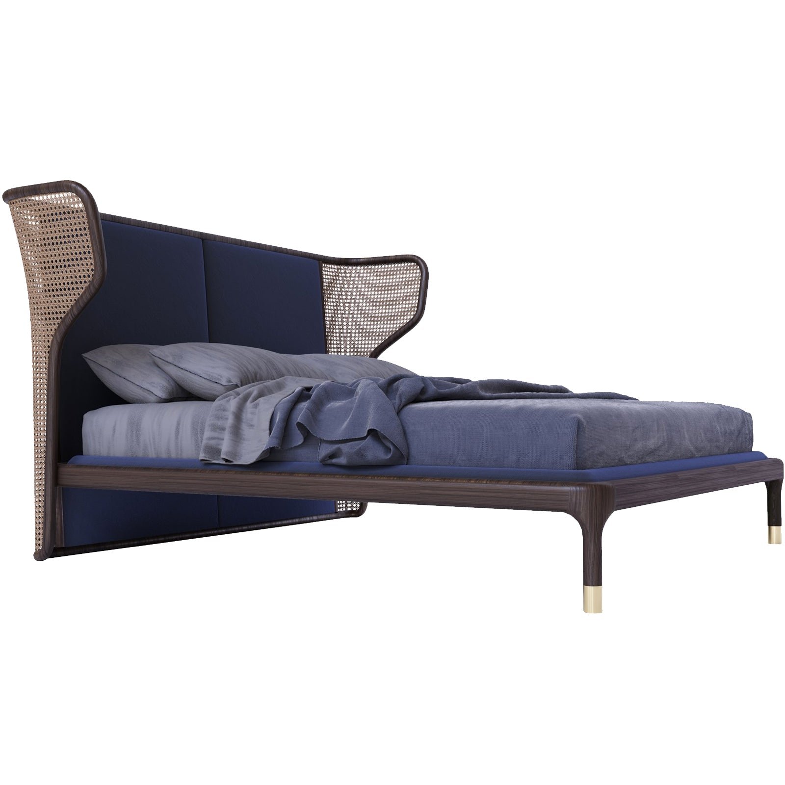 The Windflower Bed: A fusion of classic craftsmanship and contemporary design. Featuring a striking caned headboard and luxurious upholstery, this bed creates a serene yet sophisticated focal point for any modern bedroom. The refined silhouette and elegant brass accents complete its unique.